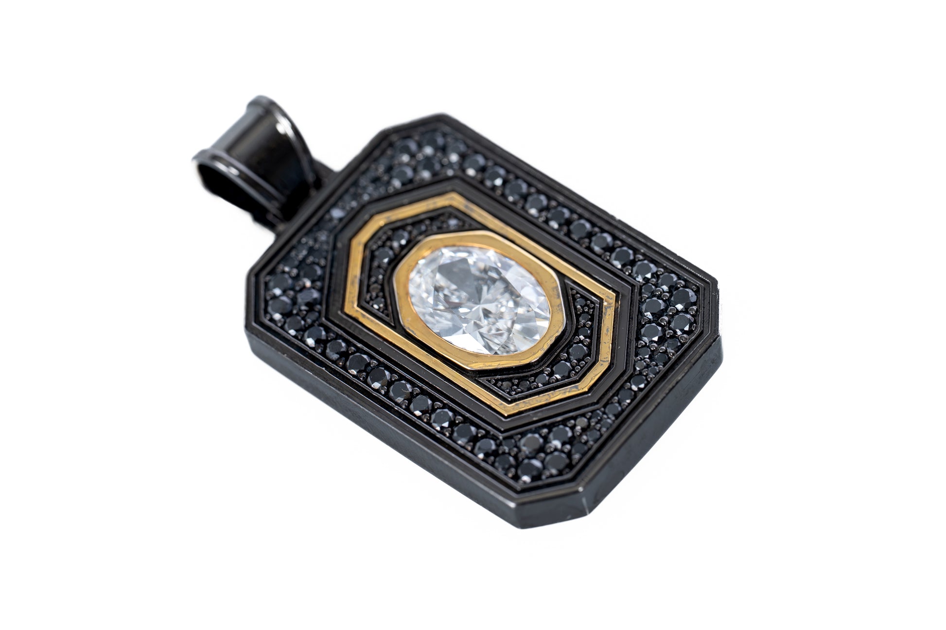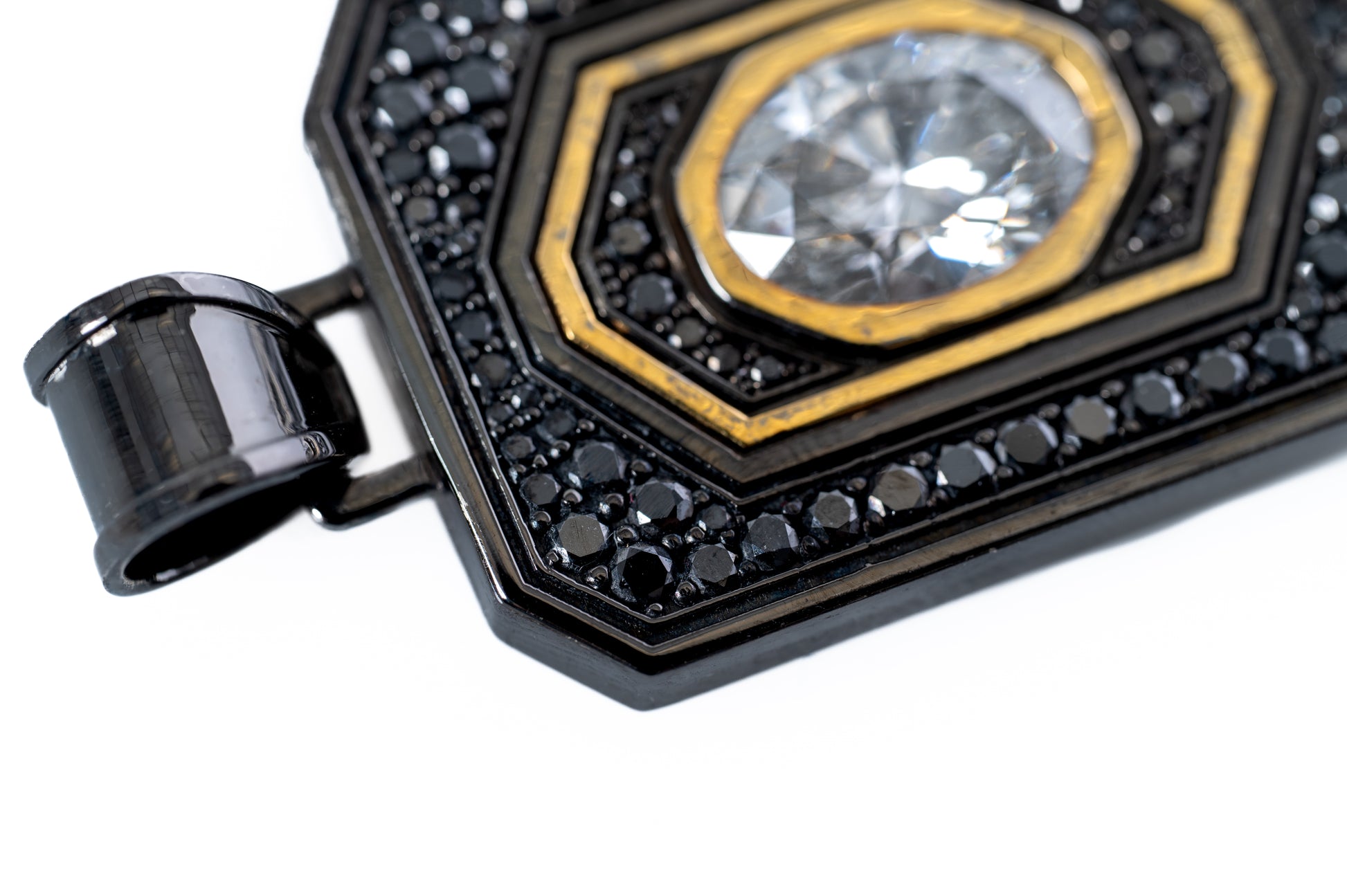 A study in contrast. A symbol of cosmic beauty. The Eclipse is forged in 10 K jet-black precision Gold and crowned with radiant gold, framing a single brilliant 3-carat diamond suspended in a field of matte-black diamond stones.