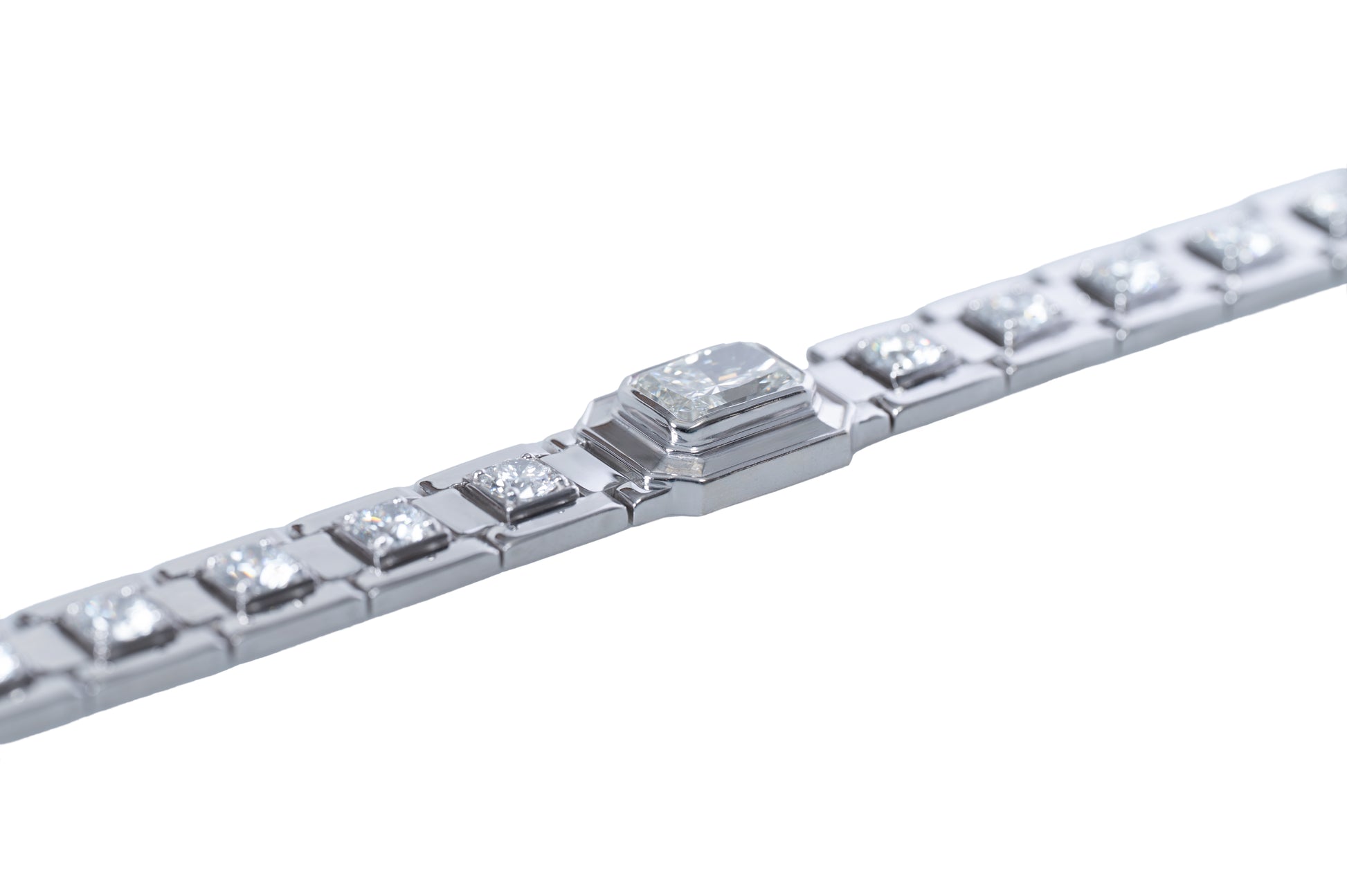 The Vanguard is more than a bracelet. It’s a statement of dominance, precision, and confidence. Featuring a commanding emerald-cut center stone flanked by a perfect sequence of brilliant rounds, this architectural masterpiece wraps the wrist in polished strength and symmetry.